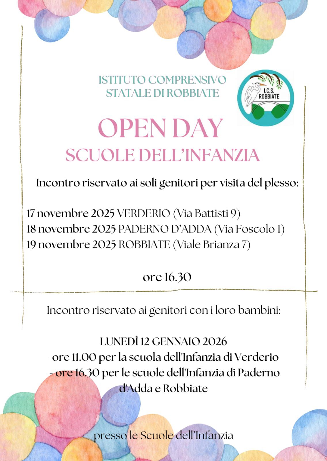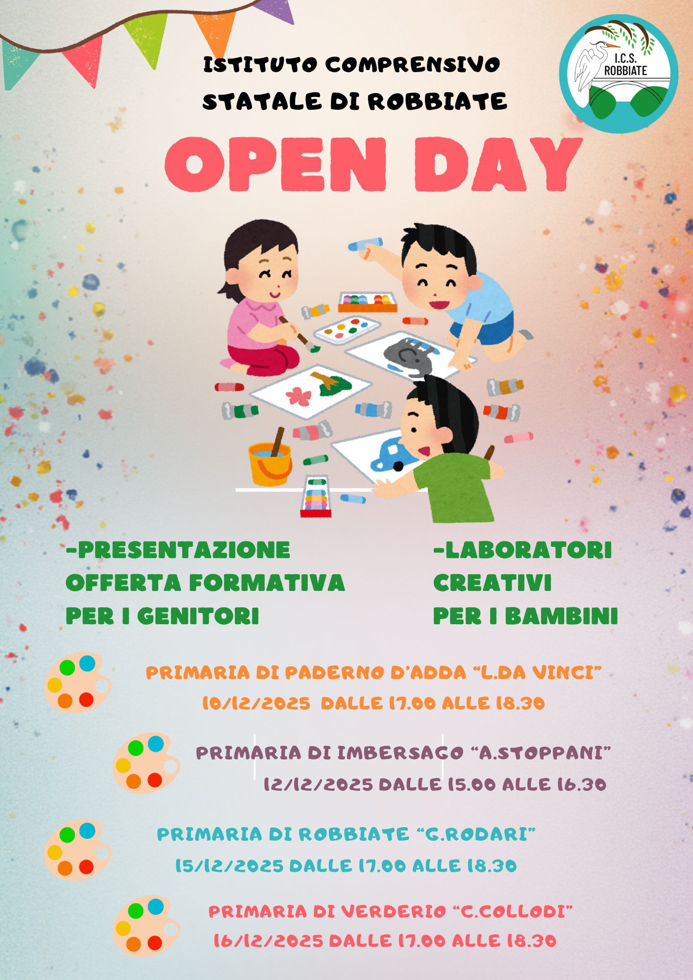 Open day delle seguenti scuole: Scuola dell'Infanzia Giuseppina Gnecchi - Scuola dell'infanzia Aquilone - Scuola Primaria Collodi