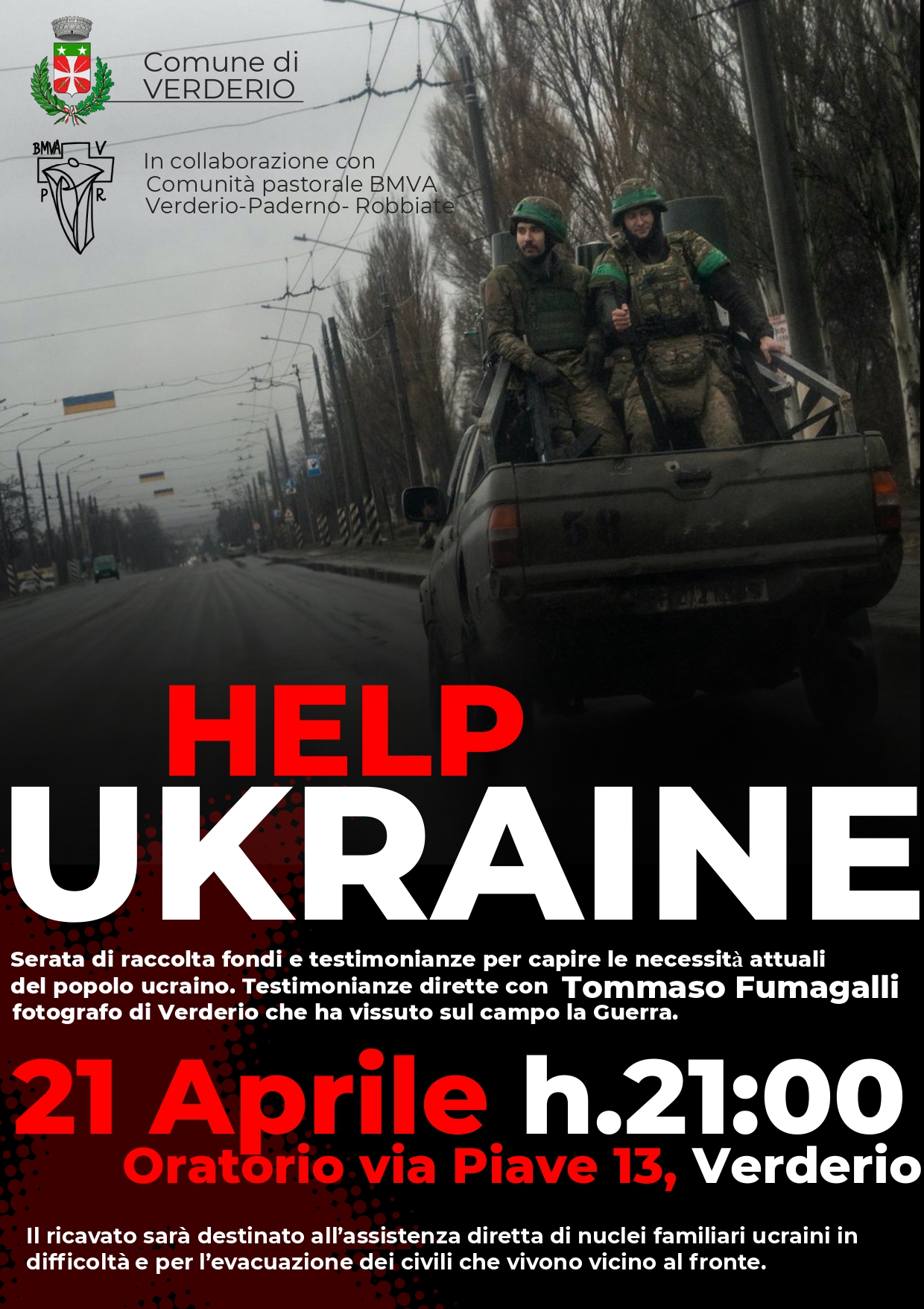 In data 21 aprile 2026 alle ore 21.00 presso l'Oratorio sito in Via Piave n. 13 a Verderio, l'Amministrazione comunale in collaborazione con la Comunità pastorale BMVA Verderio -Paderno-Robbiate organizza una serata di raccolta fondi e testimonianze per capire le necessità attuali del popolo ucraino. Testimonianze dirette con Tommaso Fumagalli, fotografo di Verderio che ha vissuto sul campo la Guerra.