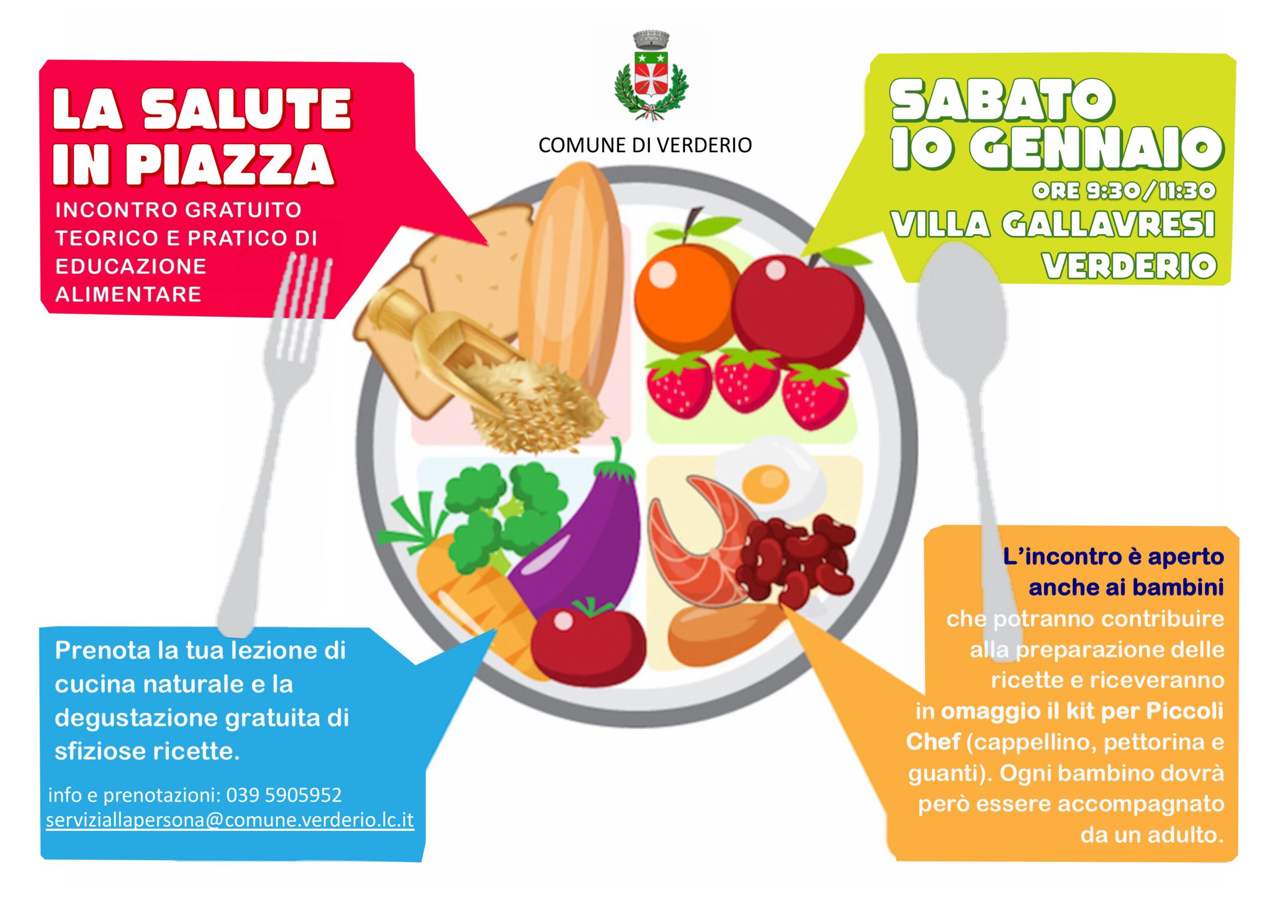 Sabato 10 gennaio p.v. dalle ore 09.30 alle ore 11.30 presso la Villa Gallavresi, sita a Verderio in Viale dei Municipi n. 18-20, è previsto l'evento "La salute in piazza" : un incontro gratuito teorico e pratico di educazione alimentare. L'incontro è aperto anche ai bambini che potranno contribuire alla preparazione delle ricette e riceveranno in omaggio il kit per piccoli chef.